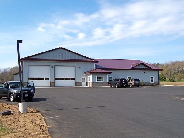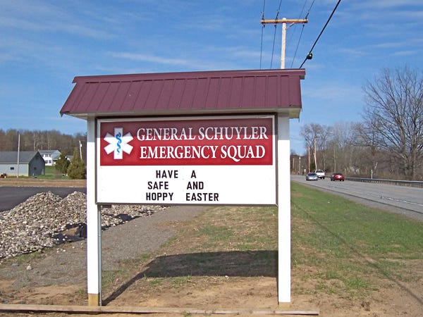 Presenting the new General Schuyler Emergency Squad headquarters in Northumberland, New York, about six miles east of Saratoga Springs. This monster truck garage with attached playrooms represents exactly the kind of political decision that we should not be making now – sinking a million bucks or more into automobile and truck infrastucture in the twilight of motoring. In ten years or less, this building will be obsolete. In the process, we have destroyed a perfectly good piece of farmland that will be needed in the future as food production gets way more local. All that is apart from the awkward ugliness of the building itself and the atrocious color motif: corpse gray with veinous red. Remember: the sum of thousands of bad political choices will be a society unable to carry on the activities of daily life.