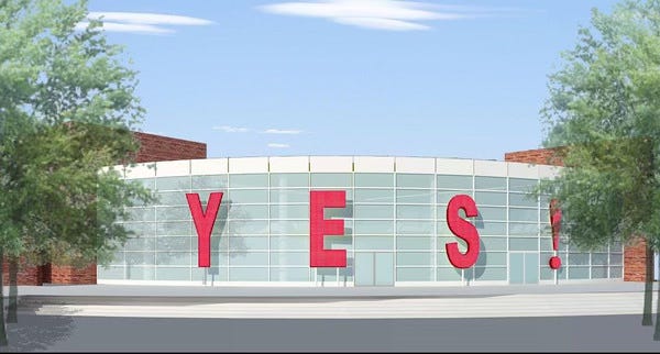 WTF ???? Behold the proposed new public artwork for the Boulder, Colorado, Library. Which part is the “art?” you may ask yourself. Why, the grand affirmation Yes! Straight out of the Nike advertising playbook, this totemic gesture informs all Boulderites (Bouldarians? Boulderopolitans? Boulderholics?) that yes! they can… er… what…? Cross the six-laner safely? Enter the building? Solicit a blow-job in the stacks? Yes! It’s all good! Yes! Anything goes. Yes! I feel better just looking at the photo. Arm pumps! Git her done! Be all that you can be! Way to go, Brownie! Mission Accomplished! Hope and change! The economy has recovered! Shale oil revolution! Industrial renaissance! the Singularity is near…! Whew….