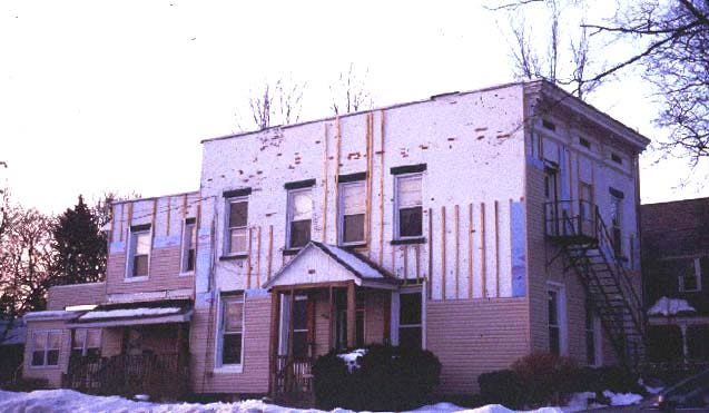 Another tragedy in the making: vinyl siding goes up over a brick row house in Saratoga Springs, New York. This helps explain why Americans have no faith in the new. In this case study, the new literally swallows up history. There are some interesting things we've learned about vinyl siding since it came into use about three decades ago. One is that exposure to sunlight makes it torque, warp, crack, and eventually disintegrate. Since paint doesn't stick to it, and it comes with the "promise" of no maintainence (so the owners won't wash it), what you inevitably get after only a few years is a dingy patina of automobile exhaust. Eventually, vinyl siding's inherent crumminess and acquired scunginess will depress the property values of all the other houses in proximity.