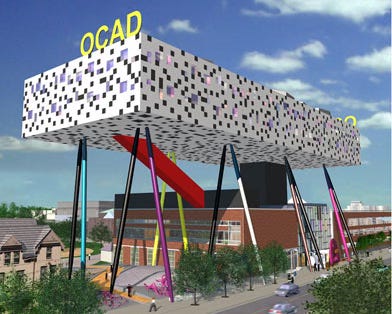 Behold the new $30 million Ontario College of Art & Design classroom and studio building by British architect Will Alsop -- a totemized retro-futuroid coffee table joined umbilically to its Soviet-style predecessor below. The message, apparently: art and design are nothing but fun fun fun. Nothing to get serious about. A playful spirit of induced hazard will keep students wondering when the checkered box might wobble free of its cute swizzle-stick legs and come crashing down on their heads. This exercise in hyper-entropic avant garde faggotry is so cutting edge that it is already out of date. The only question: which of the two conjoined buildings is more cruelly ridiculous?