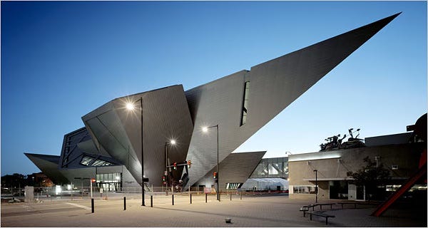 If it occurred to Libeskind that vertical walls are helpful for hanging paintings -- a medium still popular even with "cutting edge" artists -- then the architect dismissed it. Like many building stunts in our time, this one is designed to confound our expectations about the city and the behavior of its furnishings. The role of architect-as-supernatural-being requires the mystification of the public. Hence, the more tortured and alienating it is, the better the building. As city after city "bends over" for these sadistic operations, the architect takes on a persona not unlike the storied Dr. Mengele of the Third Reich.