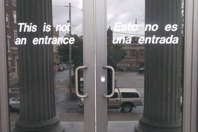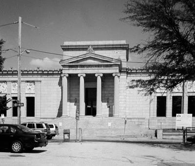 The Pawtucket, Rhode Island, library, designed in 1899 by Ralph Adams Cram and Bertram Goodhue, two greats of American monumental architecture. Assisting in their office then was young Raymond Hood, later architect of Rockefeller Center in New York City. Bas reliefs over the windows by Lee Lawrie, who went on to create the Art Deco ornaments of Rockefeller Center. Pawtucket Library officials have apparently decided that the main entrance is inadequate -- probably because it does not have the characteristics of a loading dock. When we dishonor our buildings, we end up dishonoring ourselves individually and collectively as communities.