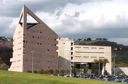 Here's the good news: the Classroom Laboratory Administration (CLA) Building on the campus of Cal Poly Pomona designed by notorious wanker starchitect Antoine Predock has been doomed to meet the wrecking ball by the Cal State board of trustees. The despotic structure was erected in 1993, hailed as "a landmark building." Its greatest claim to fame was as "a wayfinding device" from the I-10 freeway.