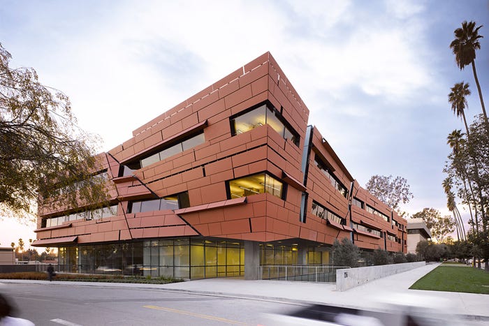 Behold the Cahill Center for Astronomy and Astrophysics at Caltech in Pasadena, California, designed by Thom Maynes’ Morphoses team. I’d call the style “Bizarro Corbu” after the early Modernist, Le Corbusier (human name: Charles-Édouard Jeanneret). Bizarro derives from the trope in the old Superman comics, “Bizarro World: an alternative universe of industrial madness populated by sub-humanoids with crystalline bodies. Note the surpassing dreariness of the ground floor with its squashed down entrance portico, dull concrete “pilotis” and ghastly chain-link fencing (a material that should be relegated to dog kennels and prison yards.) Horizontal windows, of course! And that’s a great color choice: monkey-shit orange!