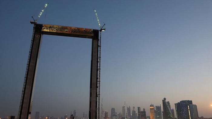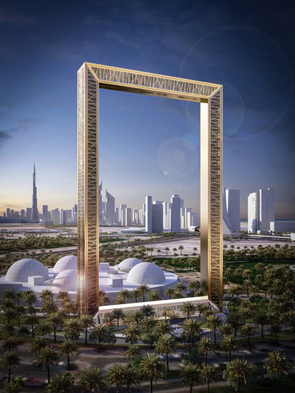 Behold the “Dubai Frame,” a lavish, gilded adornment for the tourist mecca, business hub, and glistening pearl of of the Middle East, scheduled to open this month! The vanity project of the emir’s Emaar development company, designed by Mexican architect Fernando Donis, stands 50 stories high and is expected to attract two million visitors a year to gawk at the distant Dubai skyline. They say that cultures build their most outlandish monuments just before they tank, and this one perhaps exceeds in preposterousness the earlier humdinger known as the Burj Khalifa, currently the tallest building in the world. The fate of these pop-up desert metroplexes is tied to the declining oil wealth of the Arabian peninsula, and so the coming collapse of kingdoms and emirates is as plain as the moon and the stars. Wait for it….