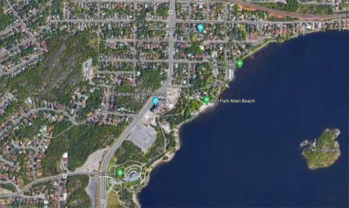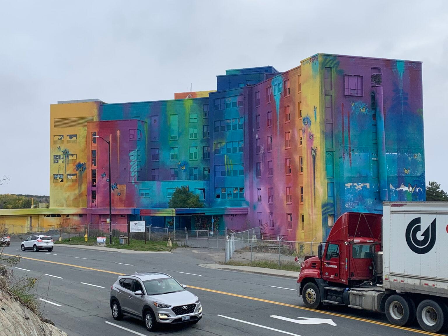Behold, the alluring paint-job on the abandoned St. Joseph’s Hospital in Sudbury, Ontario, Canada — a land renowned for its horrifying buildings. This head-shaker of a humdinger — called by locals “the once-a-year Halloween Zombie Hotel” — is the result of a backroom deal nine years ago by the City of Sudbury Council to sell the old thing to a private developer for $1. They proposed to build a conference center, including a hockey rink, casino, and four-star hotel. Original minds, I’m sure. It happens that the old hospital occupies a few acres of Sudbury’s Bell Park, fronting lovely Ramsey Lake. The Sudbury council had the chance to sell it to the Province of Ontario for $1. The deal would have included razing the building, remediating the brownfield, and reincorporating the site into the park. They passed on that. After all these years, kinda looks like the developer passed on the rink-casino-hotel, too.