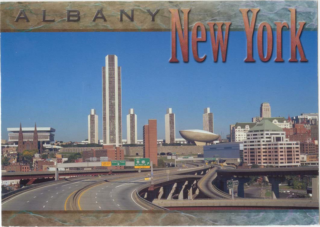 Nelson Rockefeller, the Captain Kirk of Modern Art patrons, arranged for this UFO to land like a Vulcan acropolis in in the Center of New York state's capital city around 1972. One unfortunate byproduct of the Empire State Plaza and its accessory freeway ramps: they obliterated the south end of the city. Note the granite fortification wall where the freeway terminates, and the forbidding maw of darkness that the motorist is compelled to enter in order to gain access to the internal workings of this bureaucratic mega-machine. Governor Rockefeller regarded it as a kind of ultra-pop sculpture garden, best viewed from freeway ramps. What happened on the ground didn't matter.