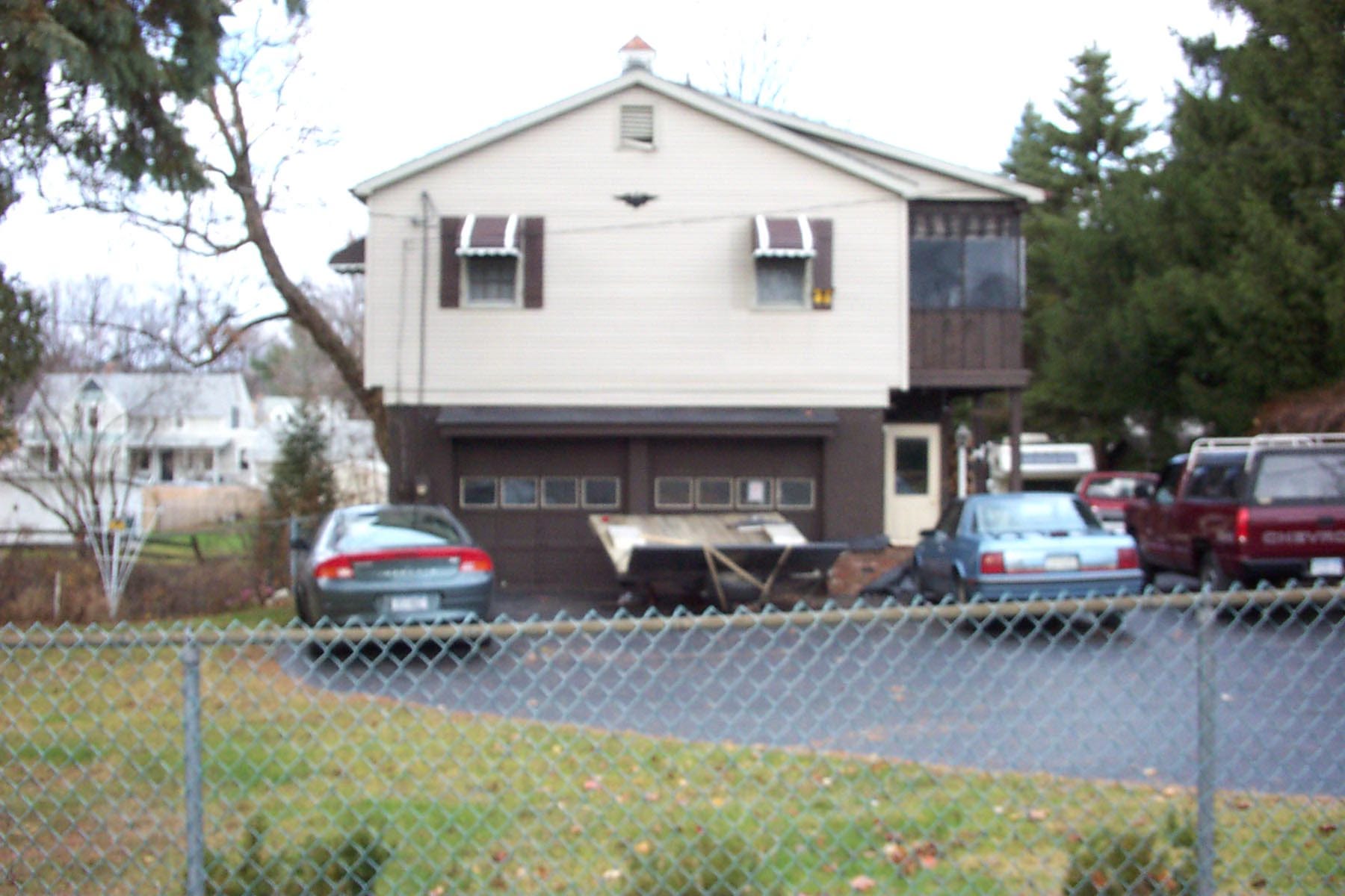 Everything that could have gone wrong with this house did go wrong. Garage facing street, monkeyshit brown and beige paint job, horrible window proportioning, screw-on shutters, pitiful canopies, service cables and pipes visible, stunted fake cupola, roof pitch sandwich on right, yard 50 percent asphalt and filled with automobiles, chain-link fence. . . .