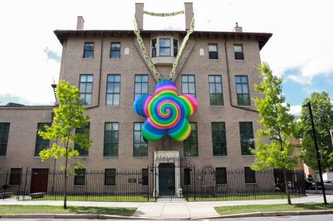 Fenway Deity is part of the Garden Deities series created by Ken Smith. The large inflatable installation, with a psychedelic spiral pattern and gold chain, will hang from the historic façade of the Museum facing the Boston Fens. Deity riffs on the Gardner’s large wheel window on the building’s rear façade, forming a transect line through the Museum, between the window and the installation. Spiritually speaking, Fenway Deityresponds to the Museum’s 2012 relocation of its entrance to Evans Way—it will serve as a new conduit for the Museum’s creative energy to protect the Fens from bad spirits and promote environmental renewal, health, and happiness along the Fenway and beyond.