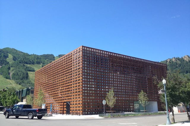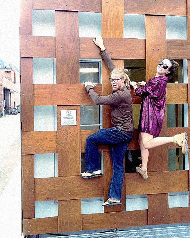 Behold the Aspen Art Museum designed by Shigeru Ban, winner of the 2014 Pritzker Prize for Architecture. As the old joke goes: is that the building or the box that the building came in? Beneath the plywood lattice stands something that looks like a dog food processing facility. See below, closeup of cheap, crappy windows behind the sportive climbers — who were slapped with a $150 fine and 10 hours of community service for attempting a technical ascent of this humdinger. Thanks to Brian Sherwin for the nomination!