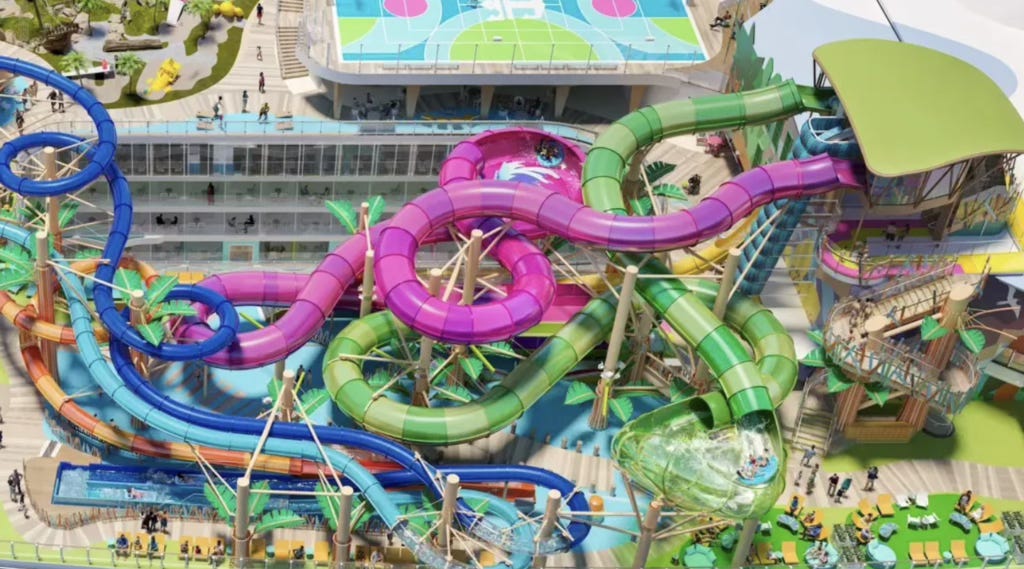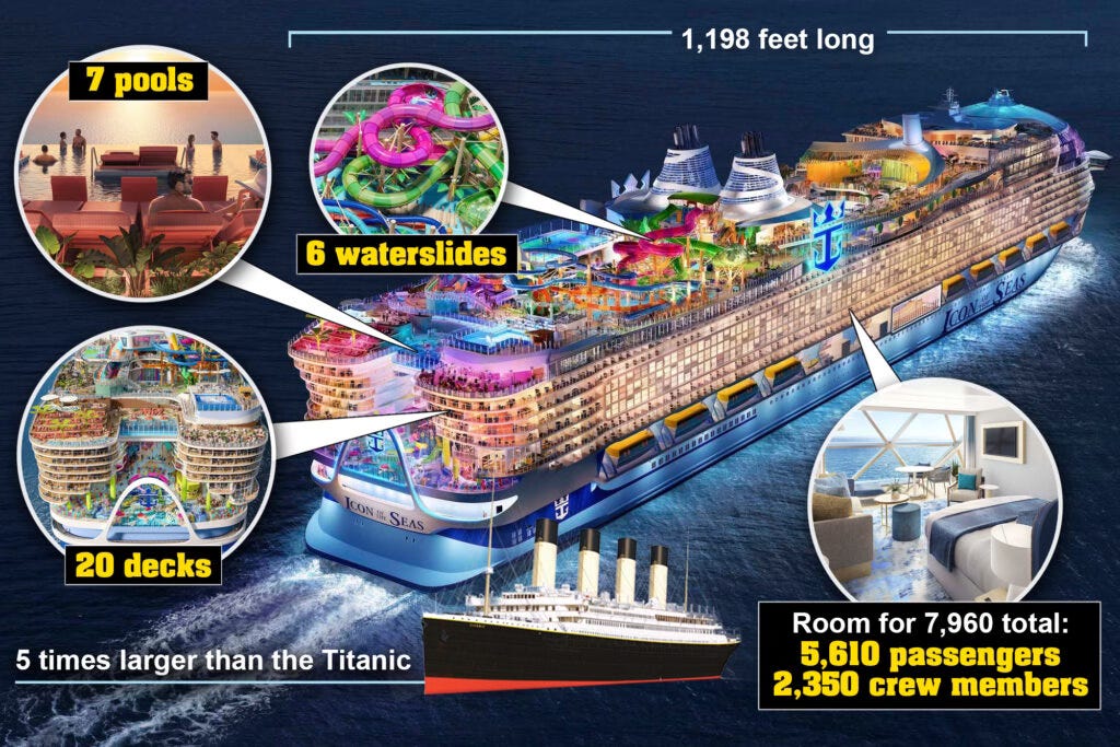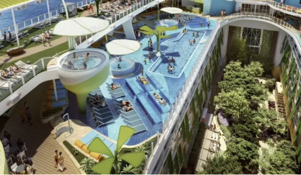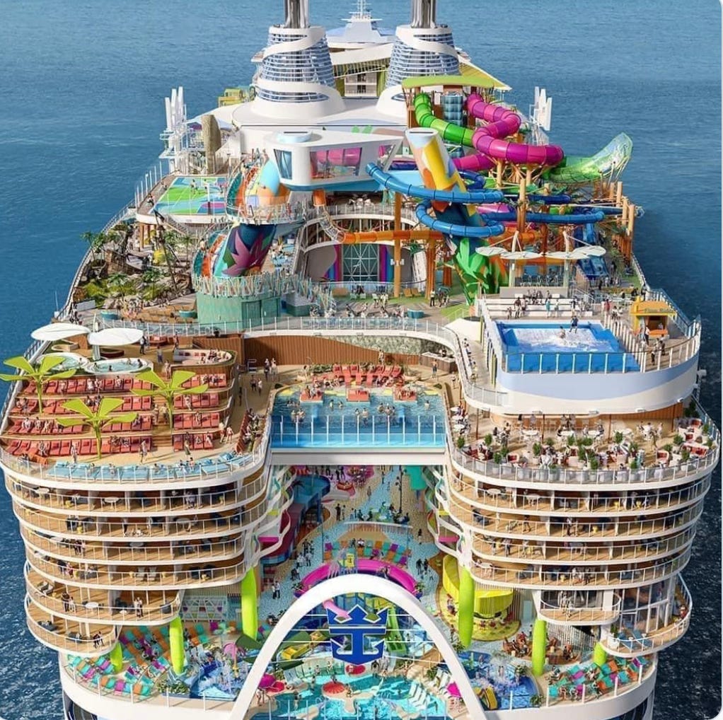 Behold, Royal Caribbean International’s new ship, Icon of the Seas. Well, okay, but icon of what, exactly, of the seas? Of the wretched excess that the cruise industry is sending forth to sail the oceans blue? I remind you: societies build their most extravagant monuments just before they collapse. This looks like the perfect vehicle for partying at the end-of-the-world (that is, the world as we know it). This monstrosity is so huge — equivalent of a 20-story building — that the promoters say it has “neighborhoods.” Below is the Royal Bay Pool in the new “Chill Island neighborhood.” Very posh, indeed. Excludes all the waddling, land-whales of the lower decks with their slushies and burritos in-hand.