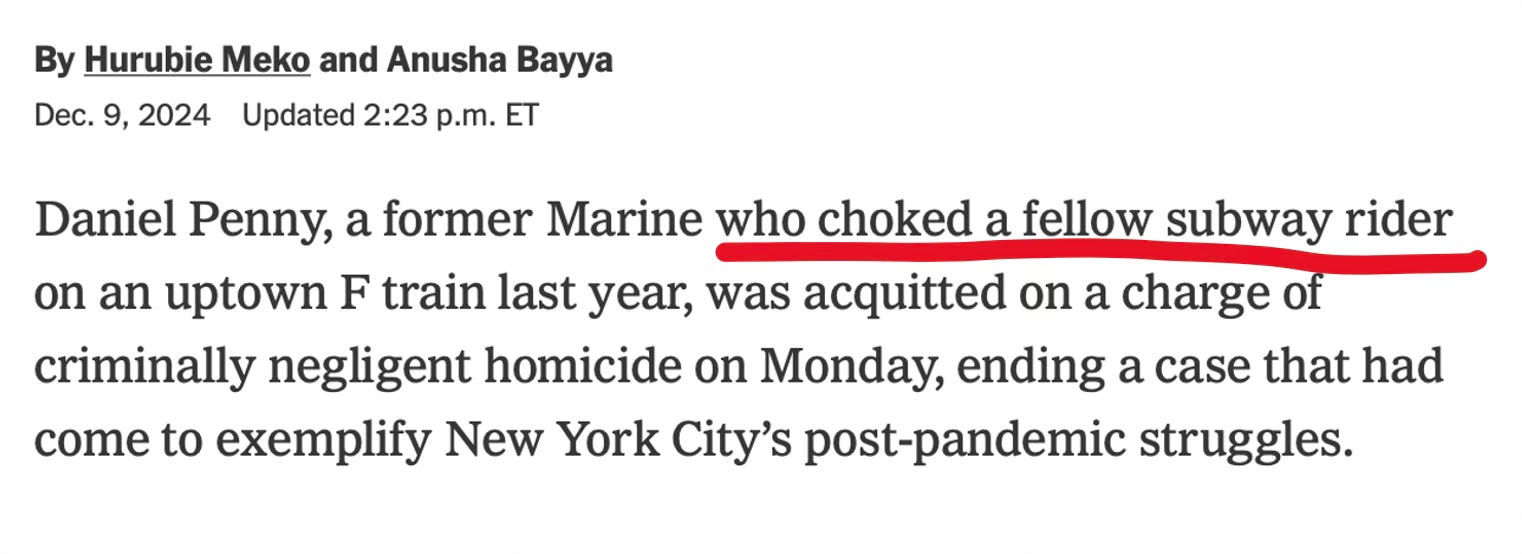 Update: At mid-day Monday, the jury acquitted Daniel Penny of the remaining charges. The case is over. Mr. Penny is free to resume his life. He was training to become an architect before the May 2023 incident when he intervened in the harassment of subway riders by the wildly intemperate Jordan Neely. Note below how The New York Times played the story, as peevishly as possible, imputing guilt despite the jury’s verdict.