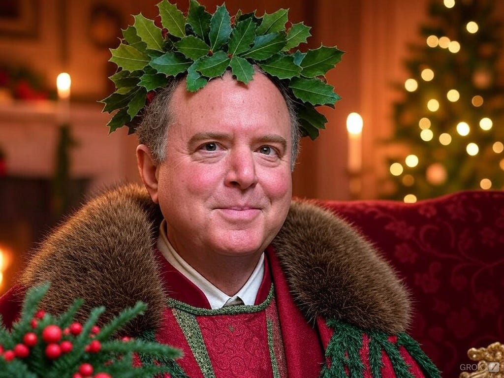 “Joe Biden” wakes again in his bedchamber. It is flooded with bright light and trappings of the holiday: a tree festooned with what appear to be gleaming glass ornaments shaped like dildoes. And before it, enrobed in scarlet and muskrat fur, the cheerful figure of Senator-elect Adam Schiff, grinning from ear to ear, with a wreath of holly about his lightbulb-shaped head. The light is blinding.