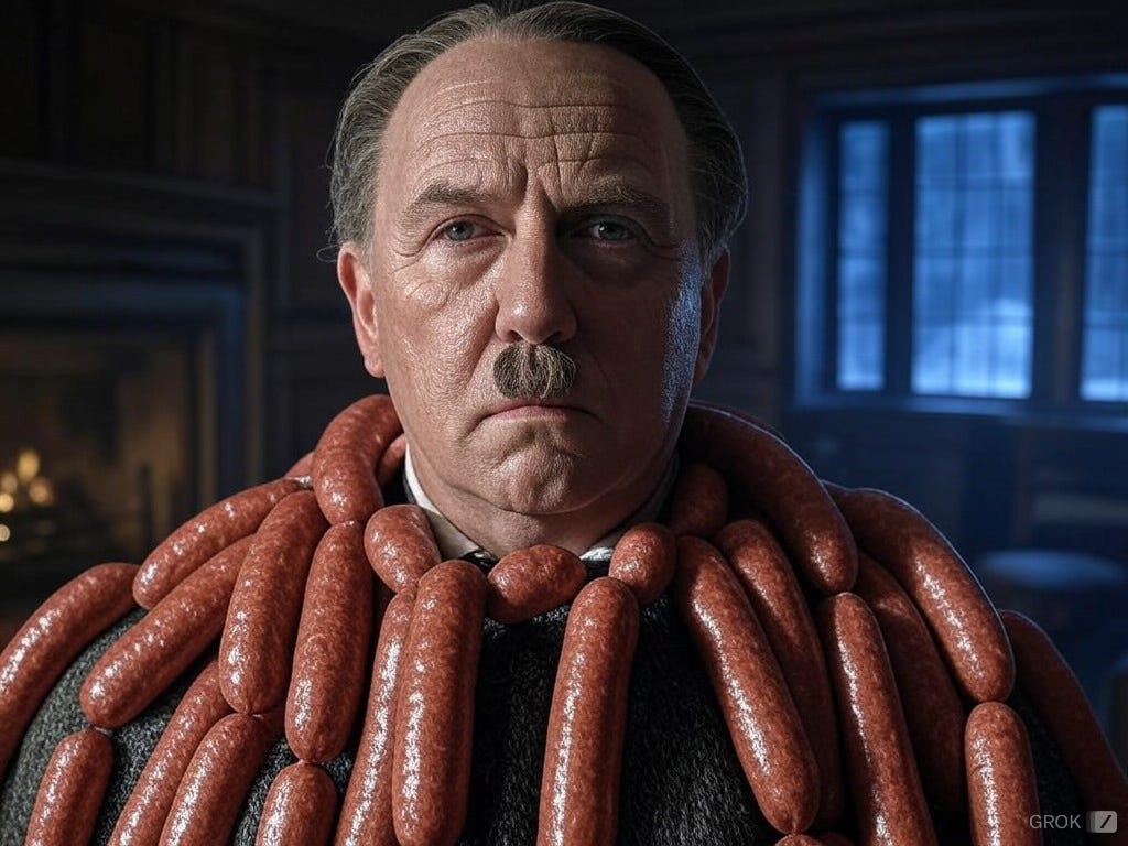 “Humbug,” he mumbled as he fell off into a cruel, blank slumber. He awakened — he knew not how many minutes longer — to a snorting noise, as of pigs rooting in a forest, followed by a thin, sonorous wailing that might have been the revenant of some once-mighty bombast in the Nuremberg Zeppelinfeld. And then resolved out of a mist the very figure of Hitler, his once-smart, gray Führeruniform tattered and threadbare, and the whole of his body wreathed in rotting sausages, the reek of which might have driven a rank of the stoutest, blondest SS leutnants to their knees in abject surrender.